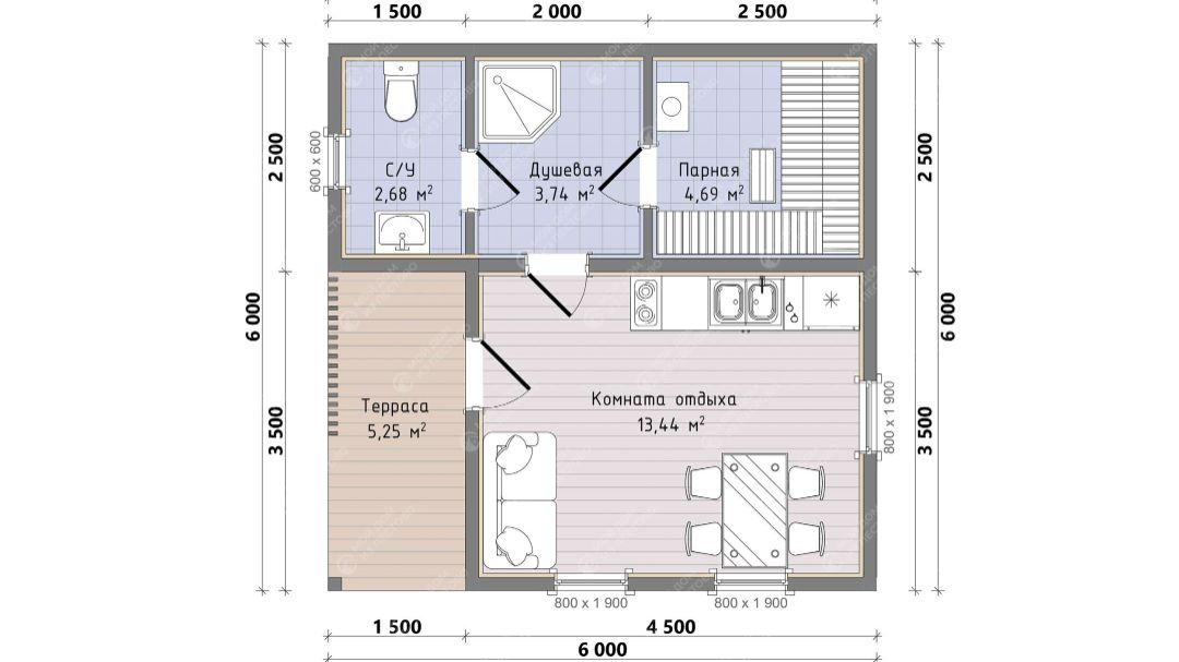 - Ступени у входных дверей и на террасе как на рисунке с общим видом, 200х40 мм.