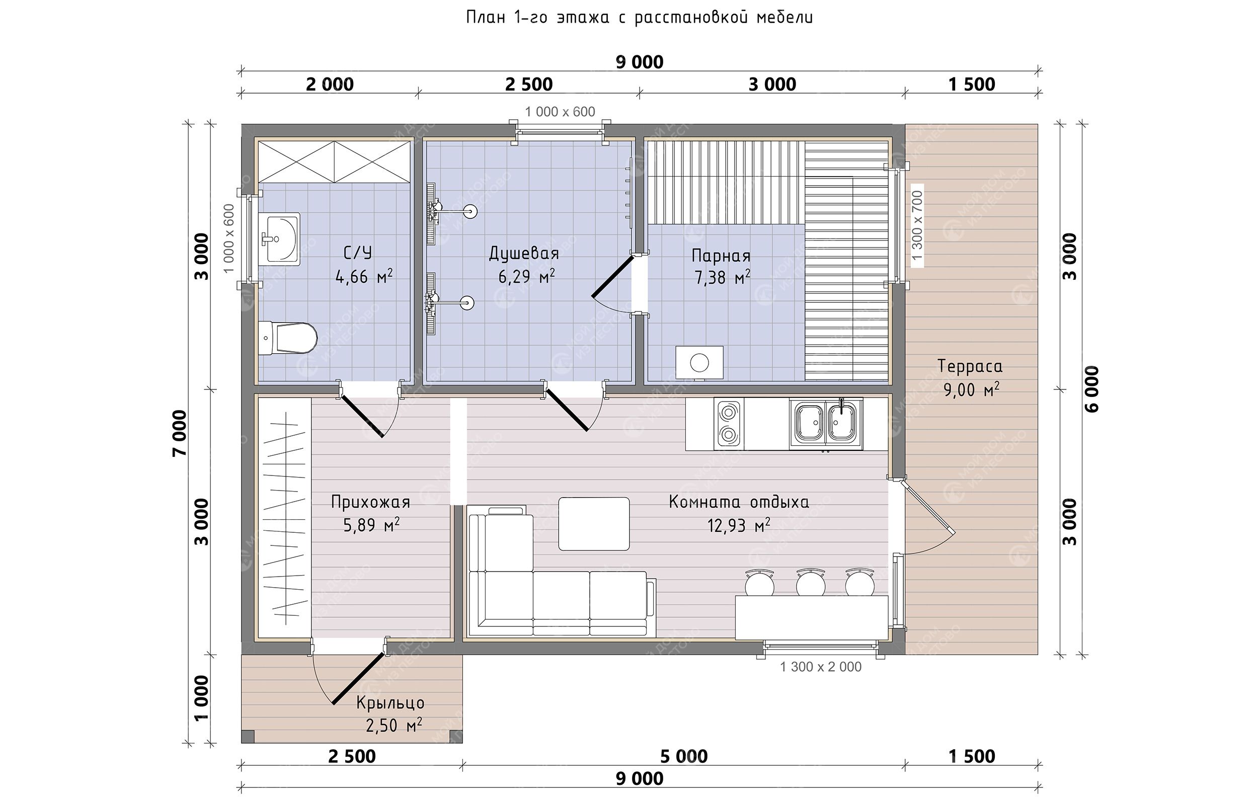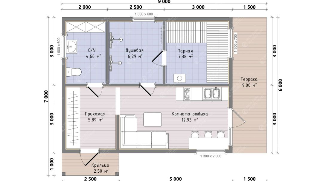 - Ступени у входных дверей и на террасе как на рисунке с общим видом, 200х40 мм.