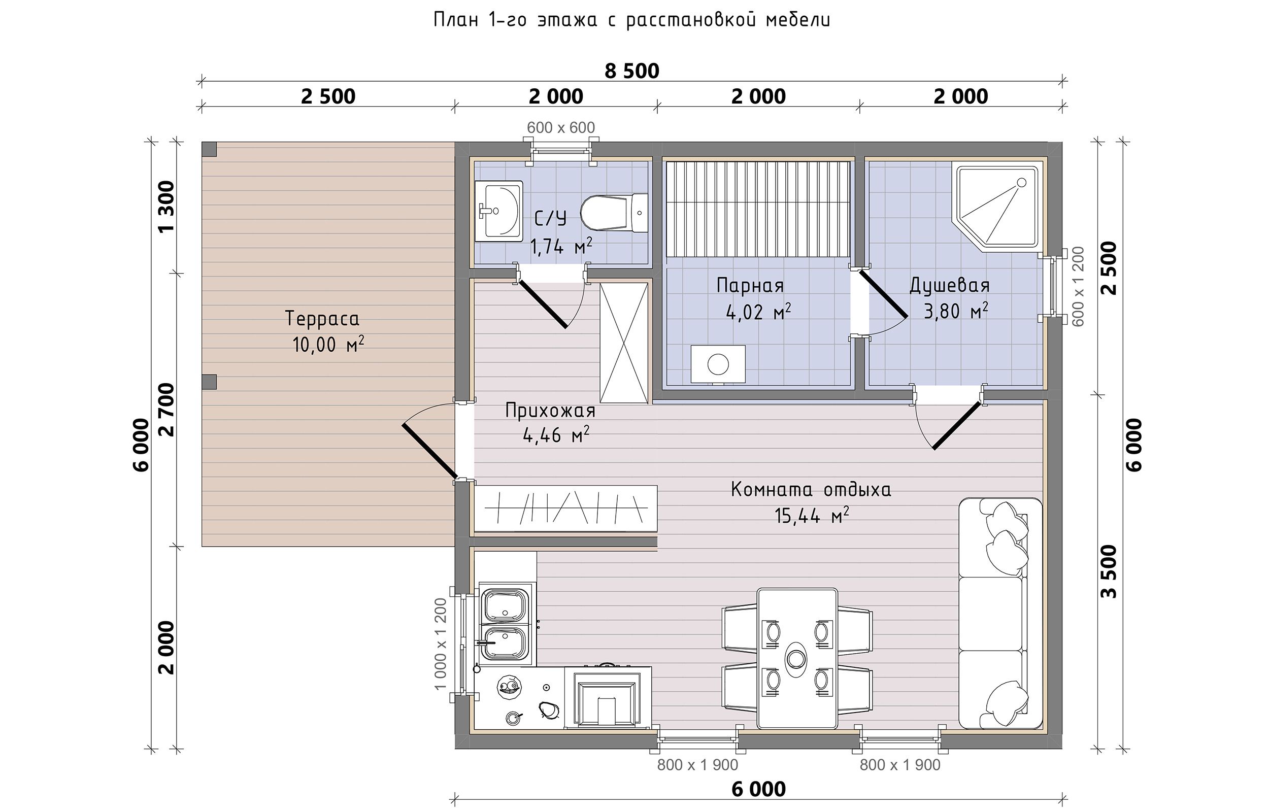Одна или две скамейки, стол и вешалка в соответствии с планом.
